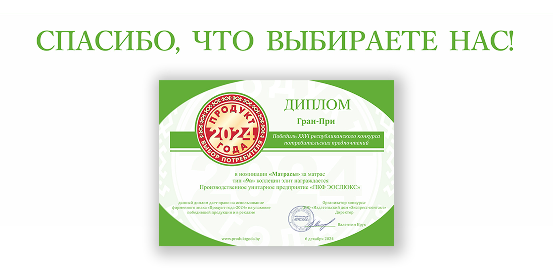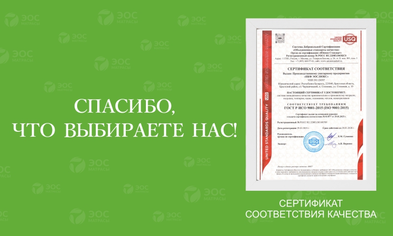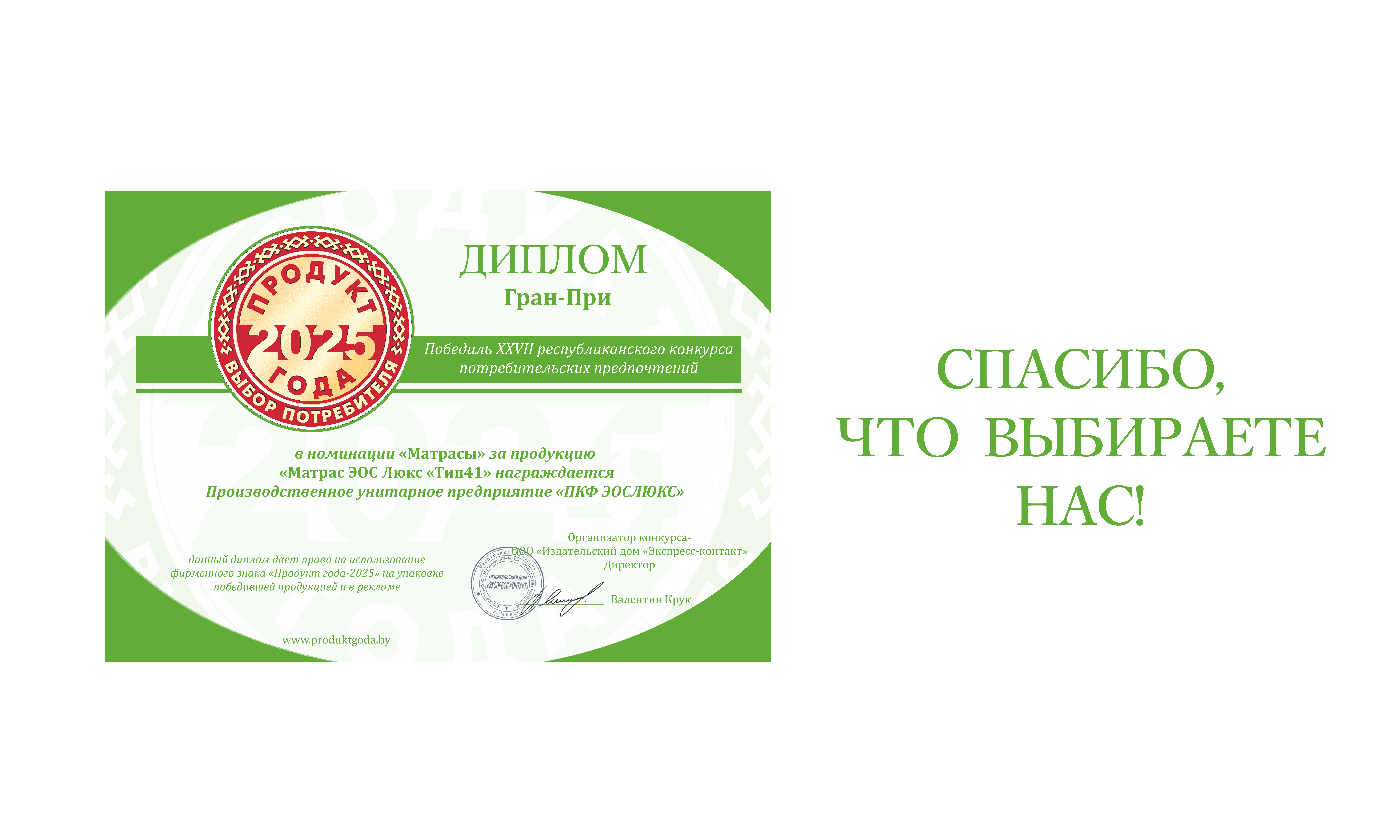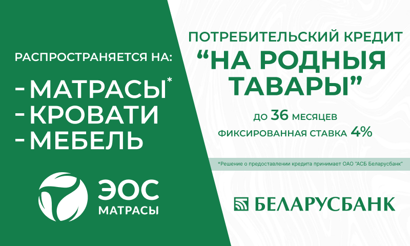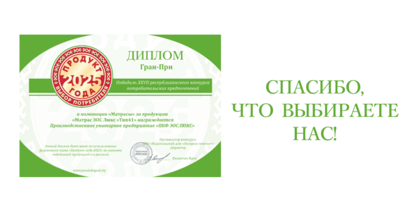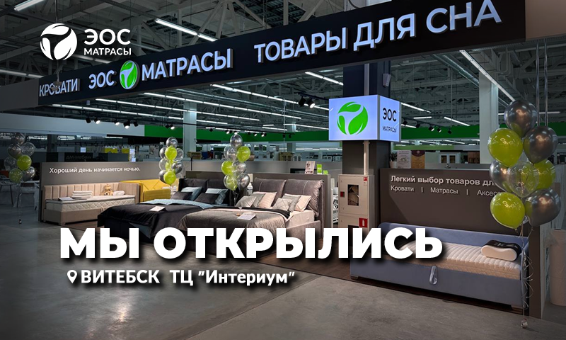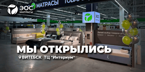 У НАС ПРИЯТНО ПОКУПАТЬ 32 ГОДА С ВАМИ Столько лет мы производим матрасы для Вас СЕРТИФИКАТЫ Вся наша продукция имеет сертификаты качества АКЦИИ и СКИДКИ Приобретайте наши товары по сниженной цене РАССРОЧКА На все товары действует рассрочка до 8 месяцев! БЕСПЛАТНАЯ ДОСТАВКА Доставим Ваш заказ от 300 р. БЕСПЛАТНО! ГАРАНТИЯ На пружинный блок даём гарантию 5 ЛЕТ! 32 года с Вами Акции Скидки Расссрочка Сертификаты качества Гарантия на пружинный блок Бесплатная доставка Популярные Категории Матрасы Наматрасники Топперы Одеяла Подушки Кровати Корпусная мебель Лидеры Продаж Кредит 4%Хит продаж Добавить к сравнению Быстрый просмотр Добавить в Избранное Матрас ЭОС Премьер Тип 9bНагрузка: 150 кгВысота: 21 смЖесткость: Высокая/Средняя Оценка 5.00 из 5 от 464,58 BYN Подробнее Этот товар имеет несколько вариаций. Опции можно выбрать на странице товара. Добавить к сравнению Быстрый просмотр Добавить в Избранное Подушка ЭОС Фея Оценка 5.00 из 5 от 33,38 BYN Подробнее Этот товар имеет несколько вариаций. Опции можно выбрать на странице товара. -10%Кредит 4% Добавить к сравнению Быстрый просмотр Добавить в Избранное Матрас ЭОС Идеал Тип 6aНагрузка: 130 кгВысота: 21 смЖесткость: Высокая/Средняя Оценка 4.95 из 5 от 374,96 BYN337,46 BYN Подробнее Этот товар имеет несколько вариаций. Опции можно выбрать на странице товара. -18%Кредит 4% Добавить к сравнению Быстрый просмотр Добавить в Избранное Матрас ЭОС Идеал Тип 1a/2Нагрузка: 120 кгВысота: 18 смЖесткость: Низкая/Средняя Оценка 4.97 из 5 от 263,73 BYN216,26 BYN Подробнее Этот товар имеет несколько вариаций. Опции можно выбрать на странице товара. -15%Кредит 4% Добавить к сравнению Быстрый просмотр Добавить в Избранное Матрас ЭОС Идеал Тип 2Нагрузка: 110 кгВысота: 18 смЖесткость: Низкая/Средняя Оценка 4.96 из 5 от 263,25 BYN223,76 BYN Подробнее Этот товар имеет несколько вариаций. Опции можно выбрать на странице товара. Кредит 4%Подушка в подарок* Добавить к сравнению Быстрый просмотр Добавить в Избранное Матрас ЭОС Элит Тип 9aНагрузка: 150 кгВысота: 23 смЖесткость: Высокая/Средняя Оценка 5.00 из 5 от 678,90 BYN Подробнее Этот товар имеет несколько вариаций. Опции можно выбрать на странице товара. -23%Кредит 4% Добавить к сравнению Быстрый просмотр Добавить в Избранное Матрас ЭОС Идеал Тип 8Нагрузка: 130 кгВысота: 21 смЖесткость: Средняя Оценка 5.00 из 5 от 366,05 BYN329,45 BYN Подробнее Этот товар имеет несколько вариаций. Опции можно выбрать на странице товара. -19%Кредит 4% Добавить к сравнению Быстрый просмотр Добавить в Избранное Матрас ЭОС Аспект Тип 7aНагрузка: 130 кгВысота: 20 смЖесткость: Низкая/Средняя Оценка 4.95 из 5 от 389,10 BYN345,73 BYN Подробнее Этот товар имеет несколько вариаций. Опции можно выбрать на странице товара. Кредит 4%Рекомендуем Добавить к сравнению Быстрый просмотр Добавить в Избранное Матрас ЭОС Премьер Тип 5aНагрузка: 150 кгВысота: 21 смЖесткость: Средняя Оценка 4.97 из 5 от 489,59 BYN Подробнее Этот товар имеет несколько вариаций. Опции можно выбрать на странице товара. -15% Добавить к сравнению Быстрый просмотр Добавить в Избранное Наматрасник защитный ЭОС «Свежесть» Оценка 5.00 из 5 от 77,49 BYN65,87 BYN Подробнее Этот товар имеет несколько вариаций. Опции можно выбрать на странице товара. -10%Кредит 4%Подушка в подарок* Добавить к сравнению Быстрый просмотр Добавить в Избранное Матрас ЭОС Элит Тип 50Нагрузка: 150 кгВысота: 29 смЖесткость: Средняя Оценка 5.00 из 5 от 668,02 BYN Подробнее Этот товар имеет несколько