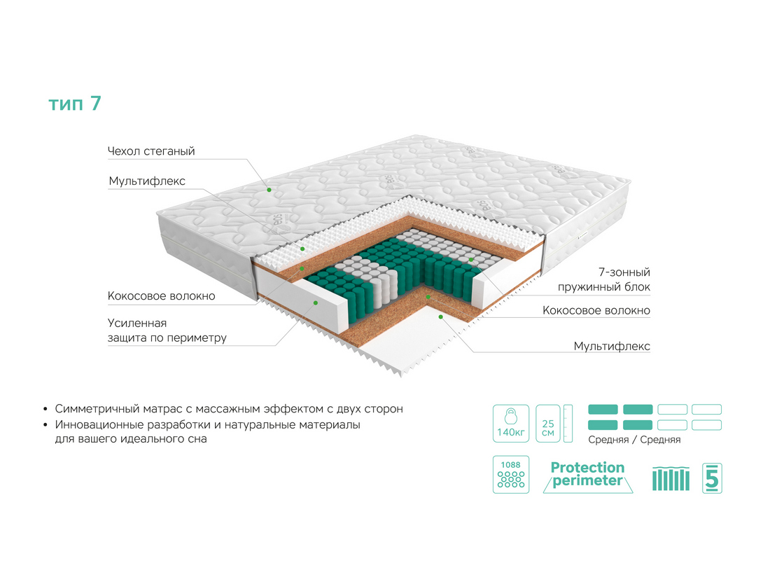 Матрас EOS Аспект 7 – это симметричный матрас с массажным эффектом с двух сторон, в котором правильно применены инновационные разработки и натуральные материалы для вашего идеального сна.