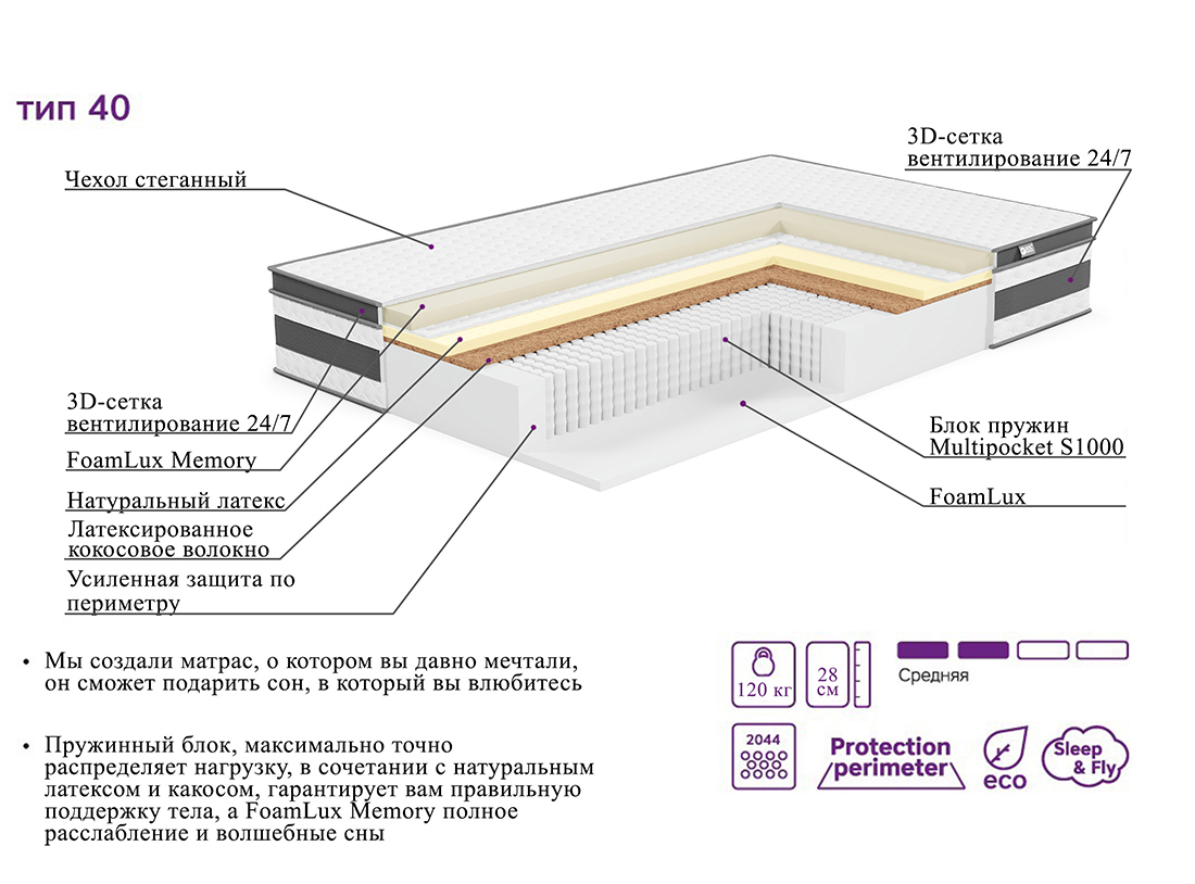 Усиленная защита по периметру из современного, эластичного, гипоаллергенного материала FoamLux удерживает пружинный блок, предотвращает проседание и потерю формы.