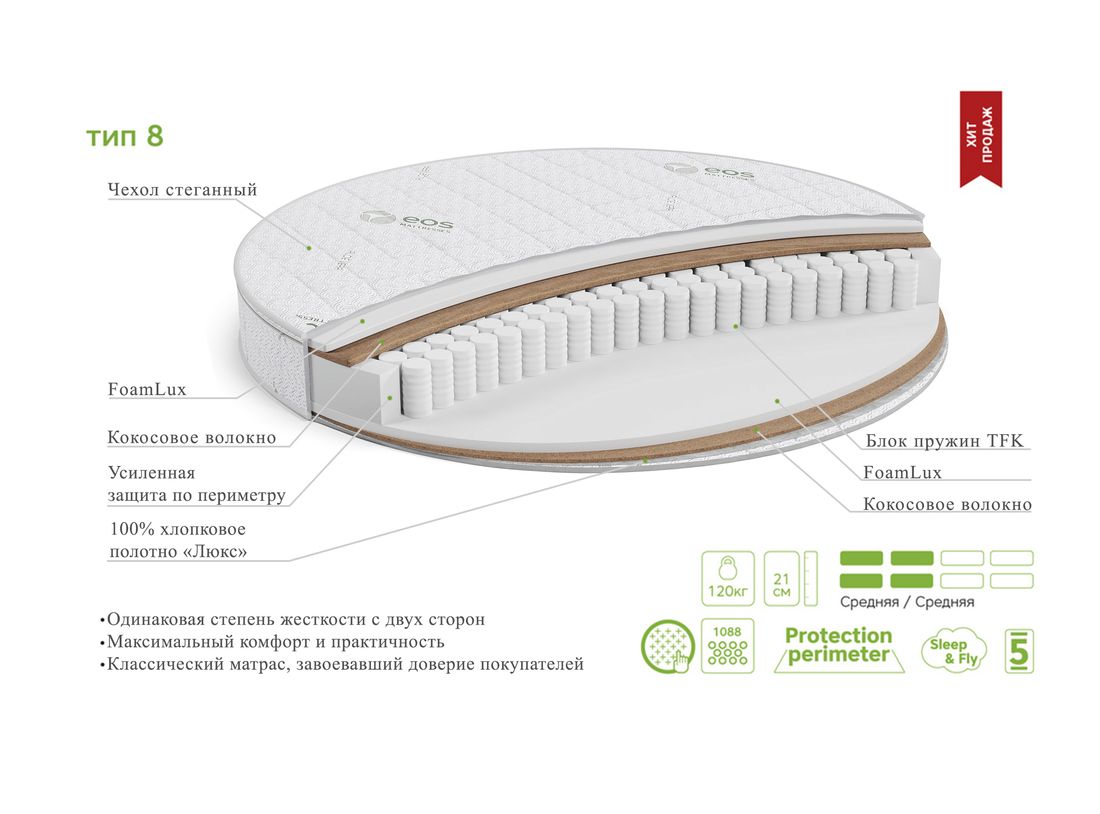 Матрас EOS Идеал 8 классический матрас с одинаковой степенью жесткости с двух сторон создающий максимальный комфорт и практичность.