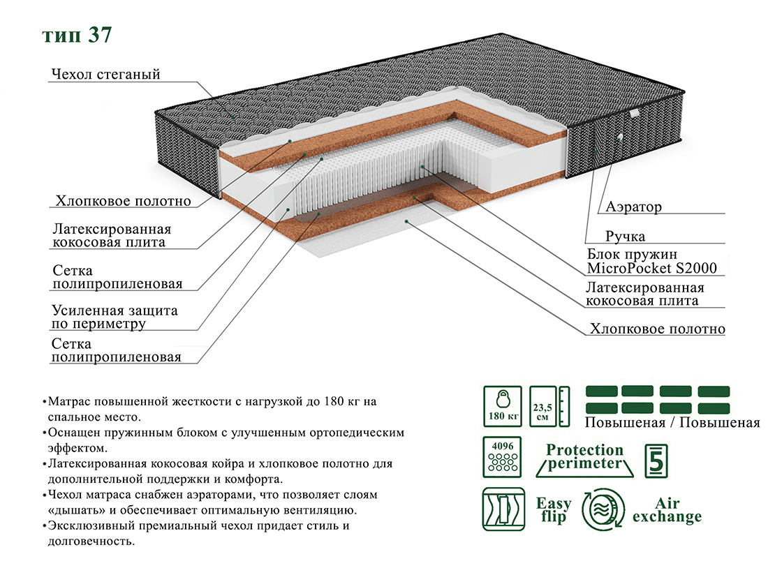 Матрас EOS Люкс «Тип 37» — это воплощение идеального баланса между поддержкой и комфортом. Его жесткая основа обеспечивает невероятную поддержку спины, позволяя вашему телу находиться в правильном положении во время сна.