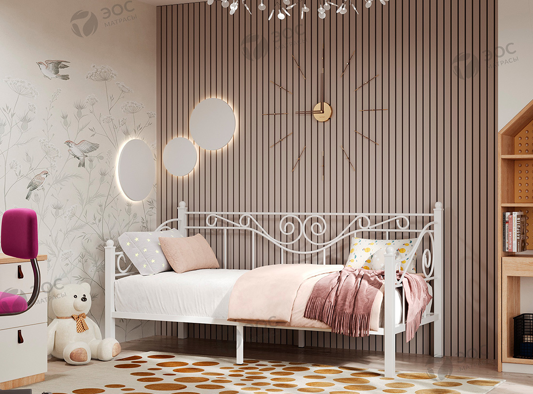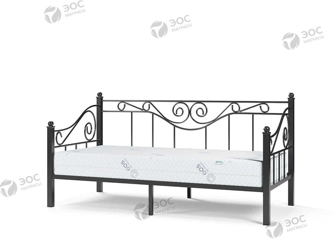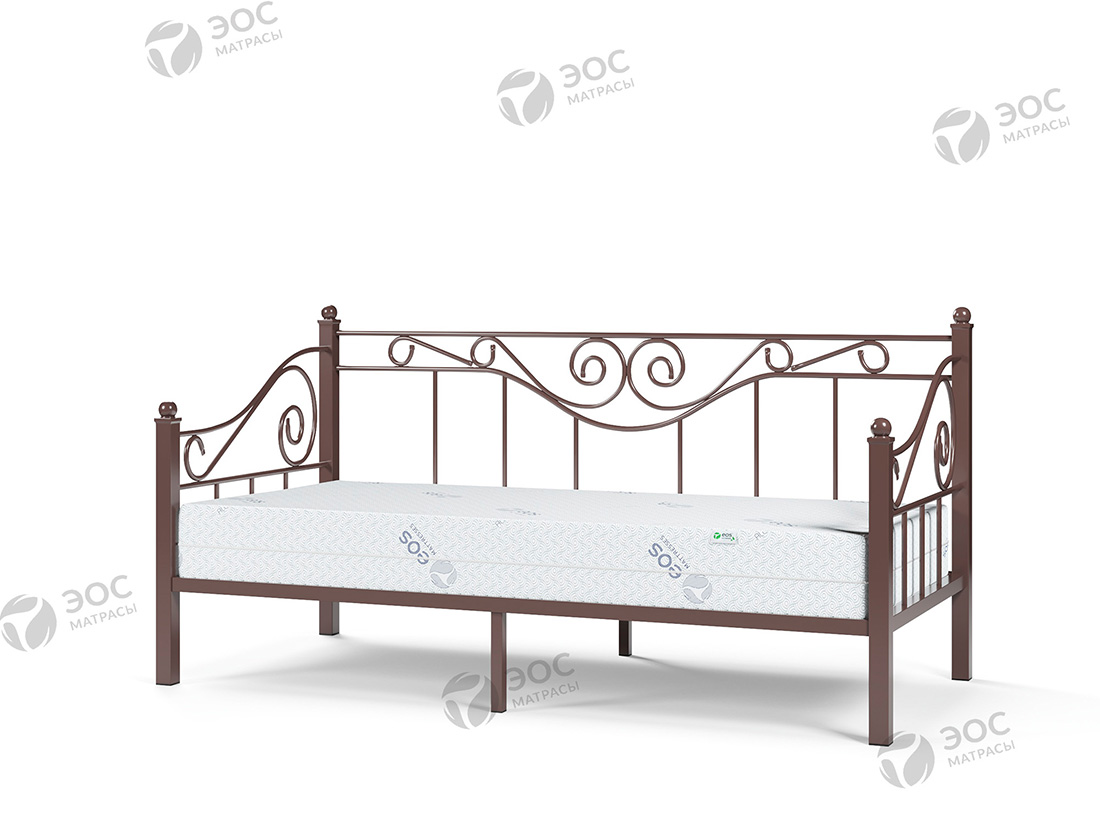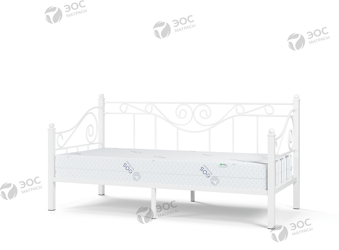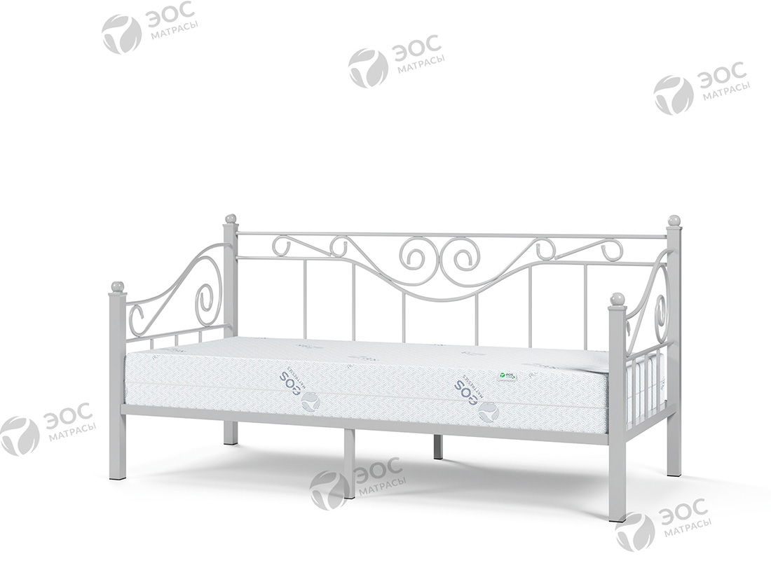 Кровать Эрика имеет форм-фактор тахты и помимо стандартных изножья и изголовья комплектуется изящной спинкой с декоративными завитками. Модель, таким образом, идеально подходит для размещения непосредственно возле стены. Кровать производится со встроенным металлическим основанием с ортопедическими ламелями. К ней отлично подойдет матрас ЭОС Тип 5а